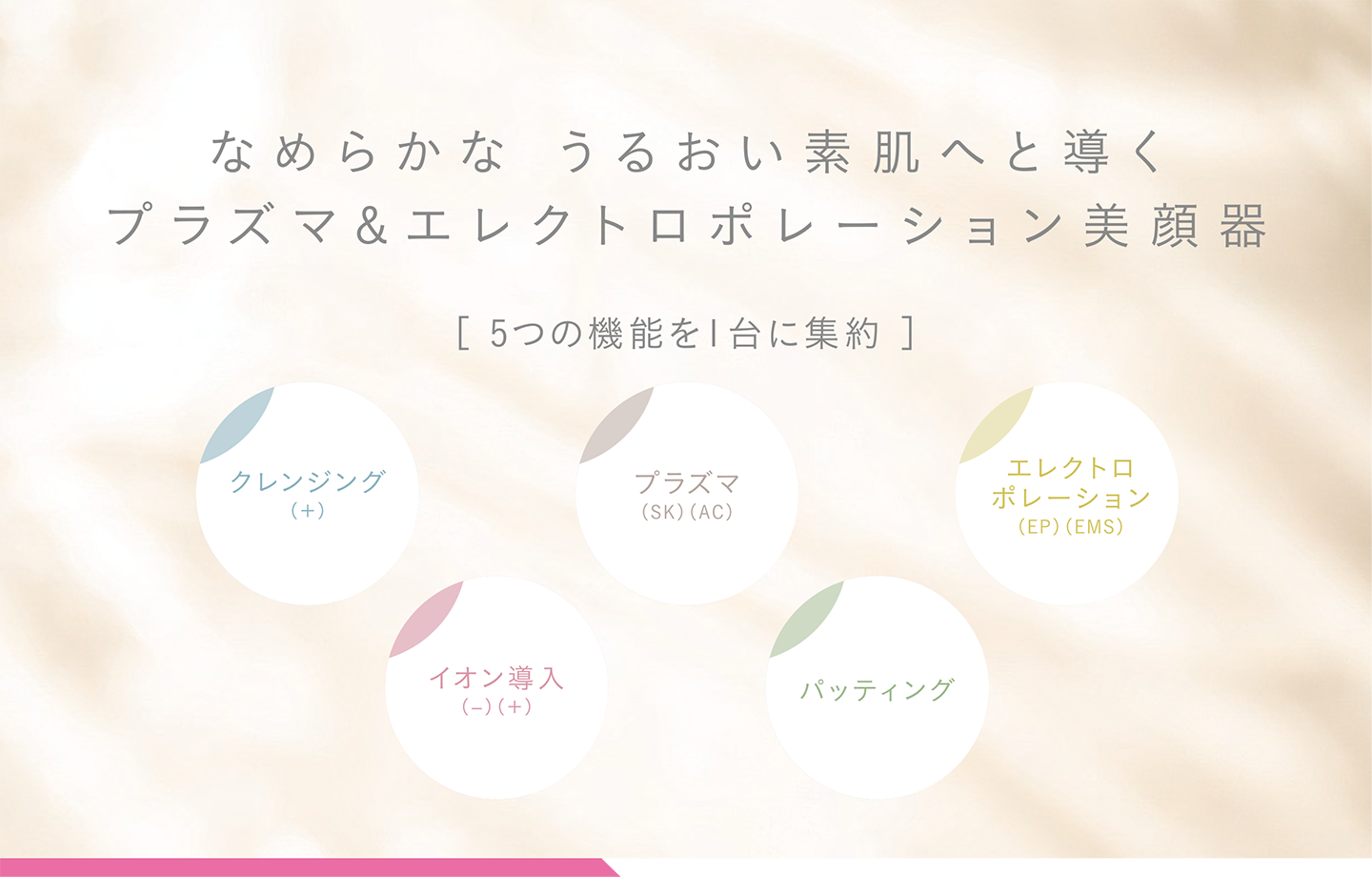 マイクロプラズマの高い反応性を利用し、浸透サポート洗浄ケアを行ないます。プラズマと青色LEDにより、スキンケアモードでは肌の表面改質を促し、美容成分の吸収を助けます。また、アクネケアモードでは有機物を除去し、皮膚表面を洗浄します。